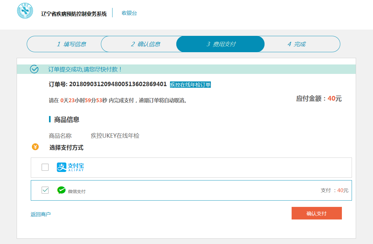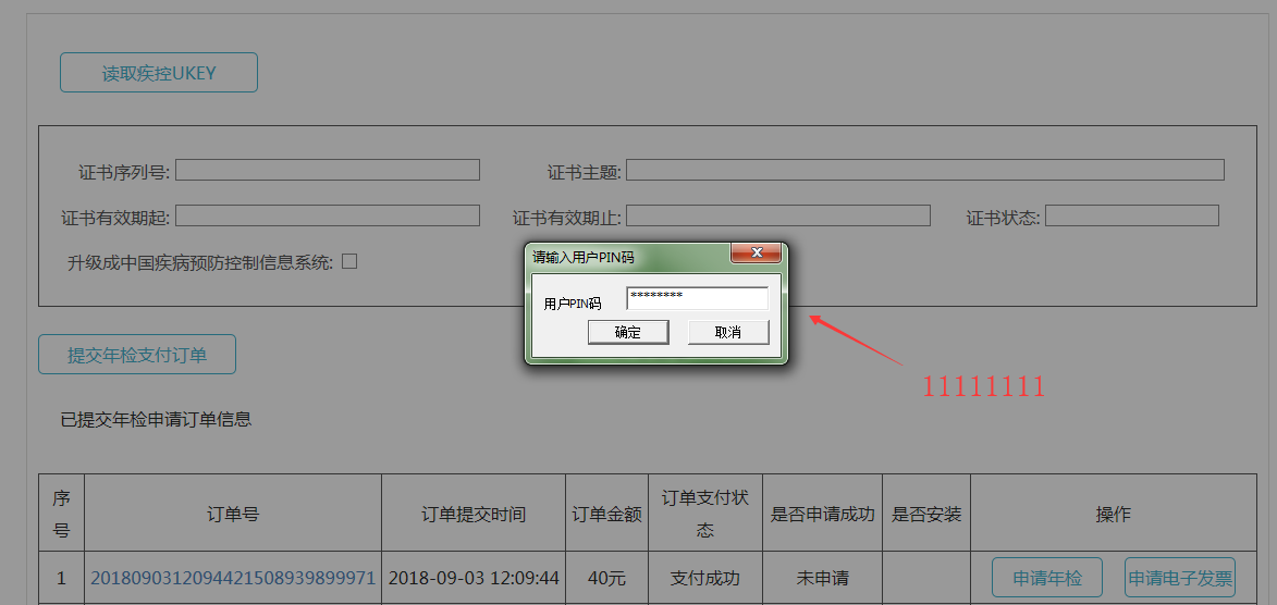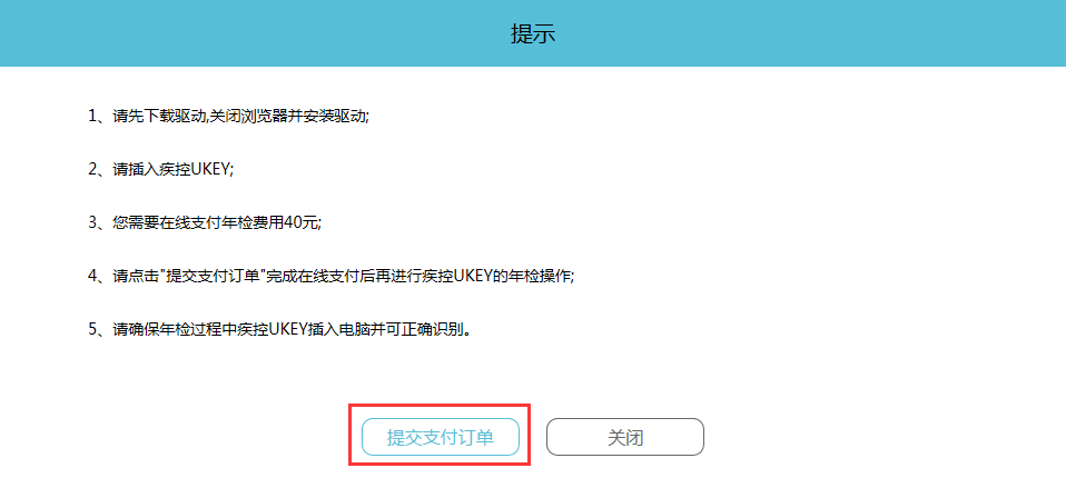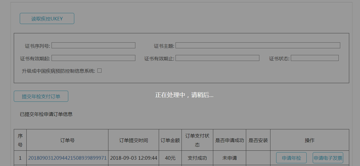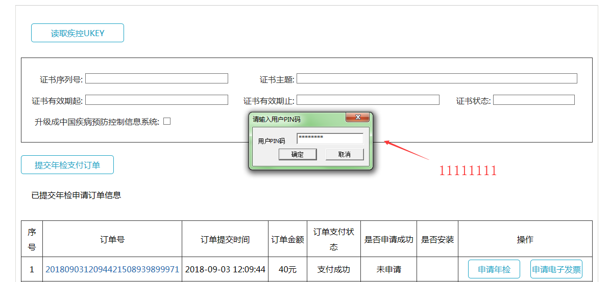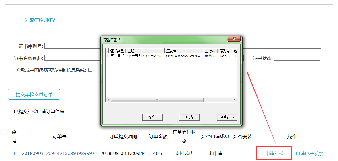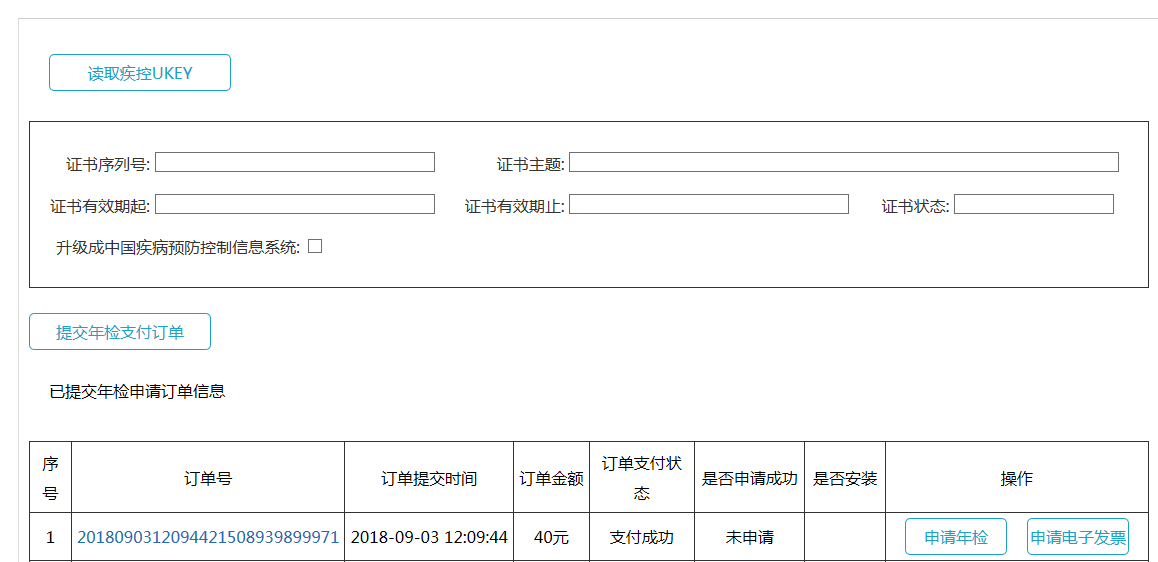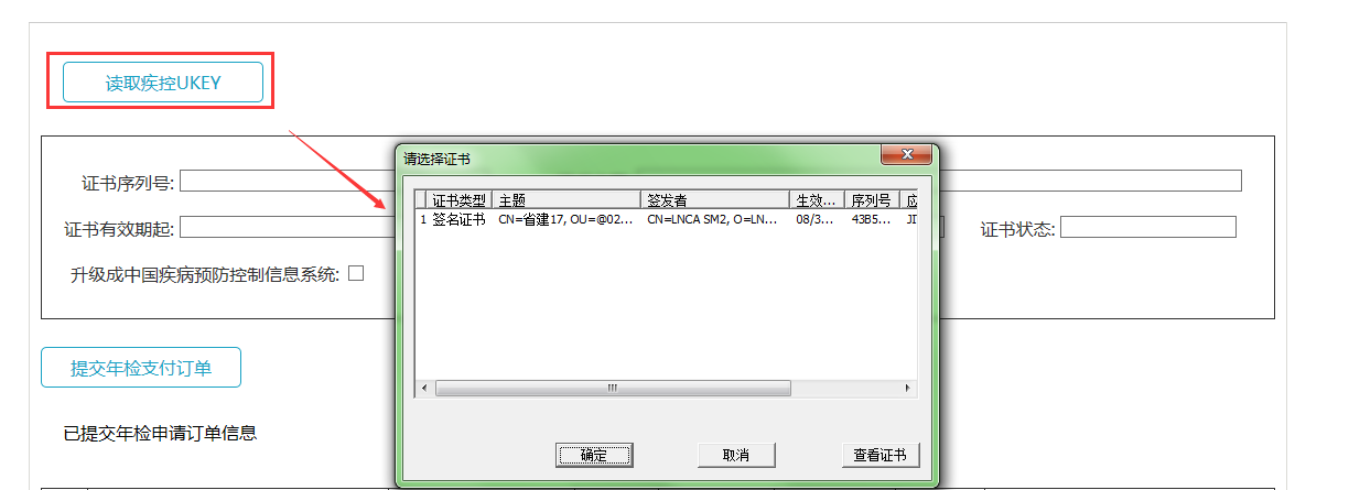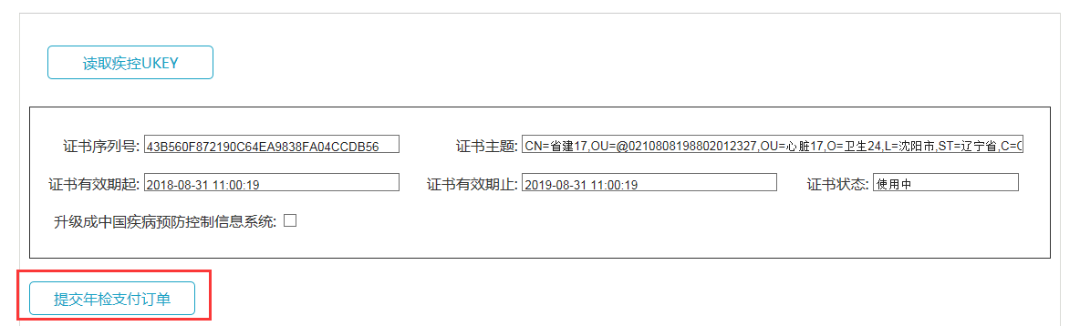 点击读取疾控UKEY按钮,此时证书信息将会显示在界面上,点击“提交年检支付订单”,如图所示