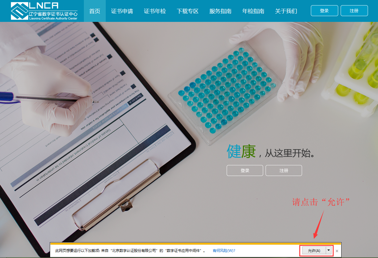 安装好UKEY驱动和国家控件,刷新页面,需要按照IE弹出的黄色提示框,如下图所示。